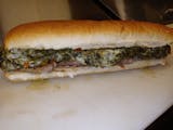 Grilled salami and capicola, melted provolone, fried onions, hot peppers, lettuce, tomato, Italian dressing, and toasted roll.